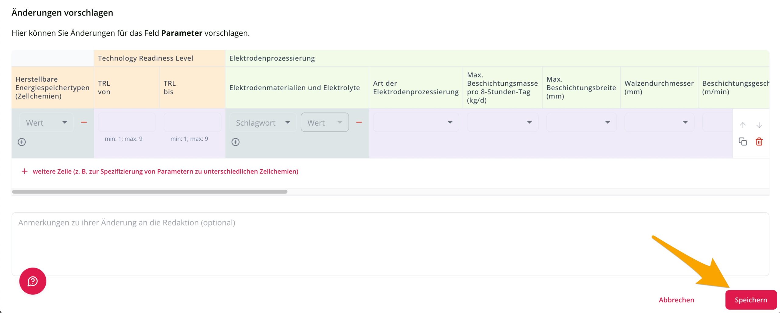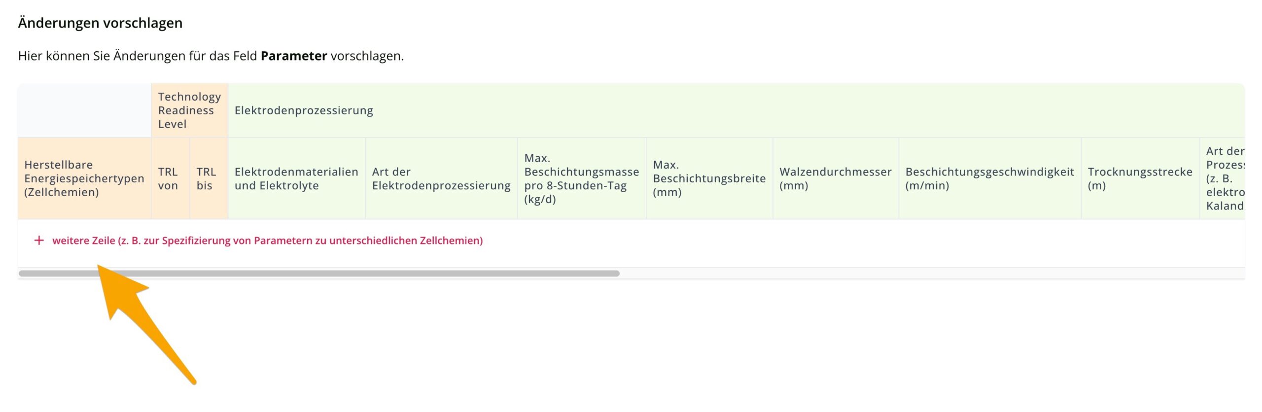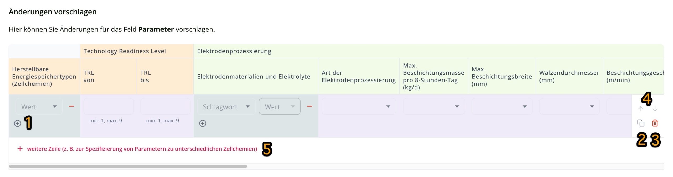 You can now start to enter or change the parameters. In some fields – such as ‘Producible types of batteries’ or ‘Electrode materials and electrolytes’ – you can select several answers. To enter an additional answer, please click on the circled plus sign (1).