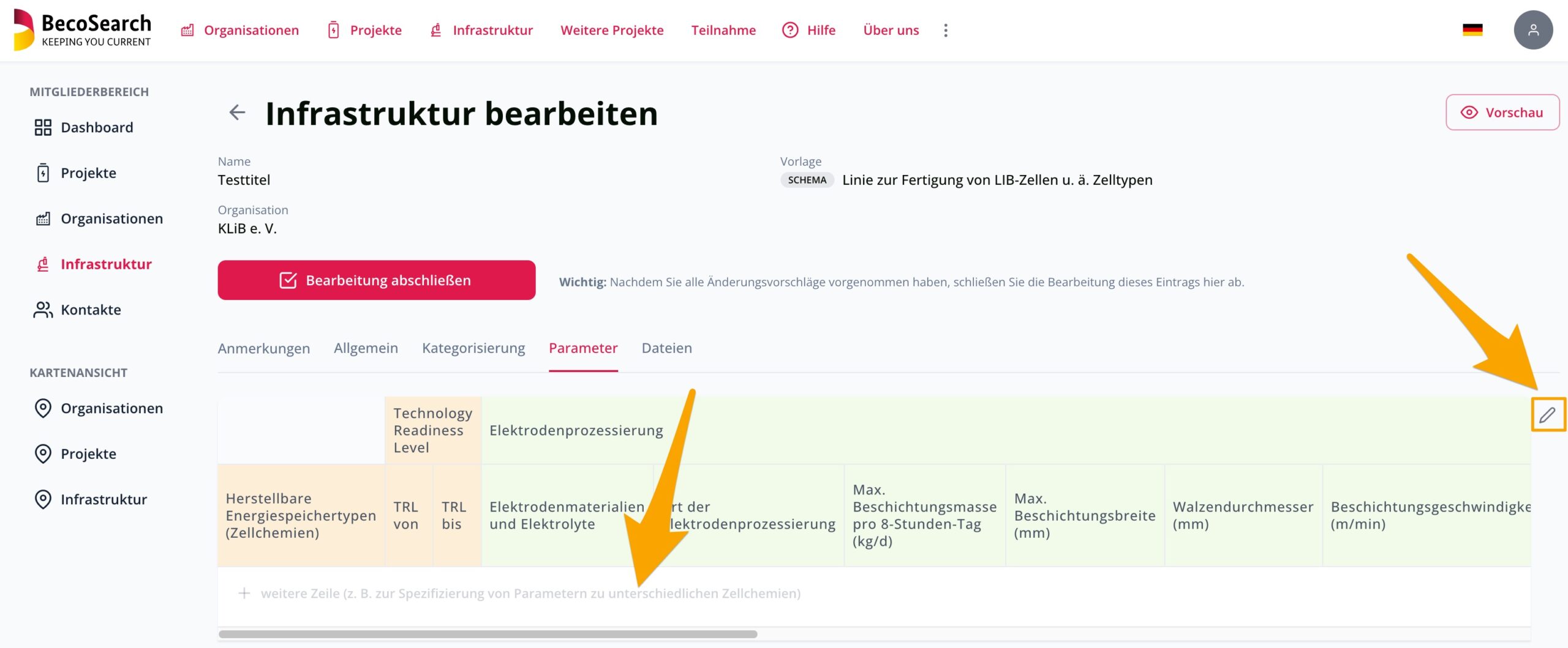 Before you can enter and edit values in the ‘Parameters’ tab, you must first select a detailed infrastructure for editing (create it first if necessary), open it in the member’s area and switch to the ‘Parameters’ tab (you can find out how to do this here).